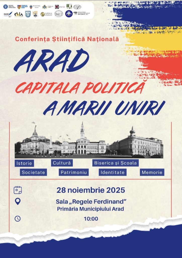 Vineri, 28 noiembrie 2025, începând cu orele 10:00, în semn de recunoaștere a acestui rol esențial, Sala „Regele Ferdinand” a Primăriei Municipiului Arad găzduiește Conferința Științifică Națională „Arad – Capitala Politică a Marii Uniri”, un eveniment dedicat cercetării academice și evidențierii memoriei istorice a anului 1918.