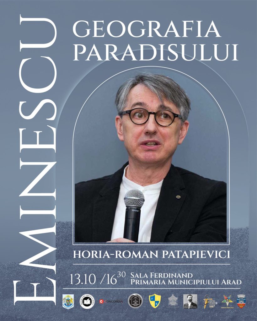 Luni, 13 octombrie, de la ora 16:30, în Sala Regele Ferdinand a Primăriei Arad, publicul arădean are ocazia de a-l întâlni pe unul dintre cei mai importanți intelectuali români contemporani, Horia-Roman Patapievici, care va susține conferința intitulată „Eminescu: geografia Paradisului”.