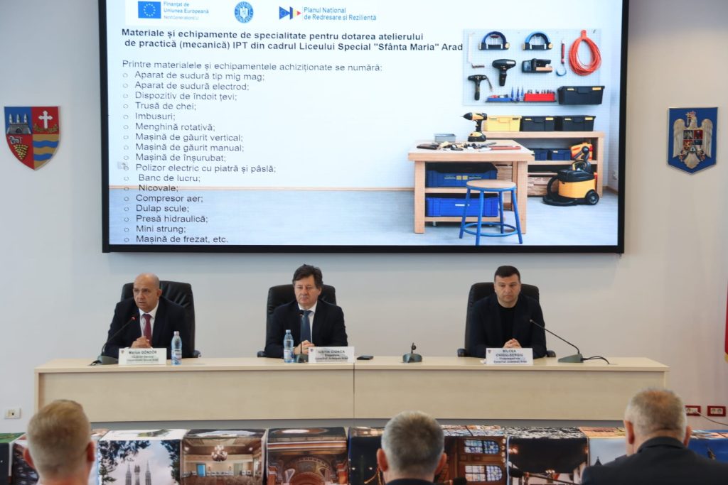 Consiliul Județean Arad a finalizat cel mai important proiect de modernizare a sistemului școlar din județ, dotarea cu mobilier și echipamente IT a aproape 200 de săli de clasă, din 18 unități școlare. Modernizarea a fost posibilă printr-un proiect european, intitulat „Dotarea cu mobilier, material didactice și echipamente digitale a unităților de învățământ preuniversitar și a unităților conexe din județul Arad” și accesat de către Consiliul Județean Arad și finanțat prin Planul Național de Redresare și Reziliență (PNRR). Acestui proiect i se alătură celelalte două, pentru sistemul educațional, prin care s-au cumpărat microbuzele electrice pentru transportul copiilor la școală.
