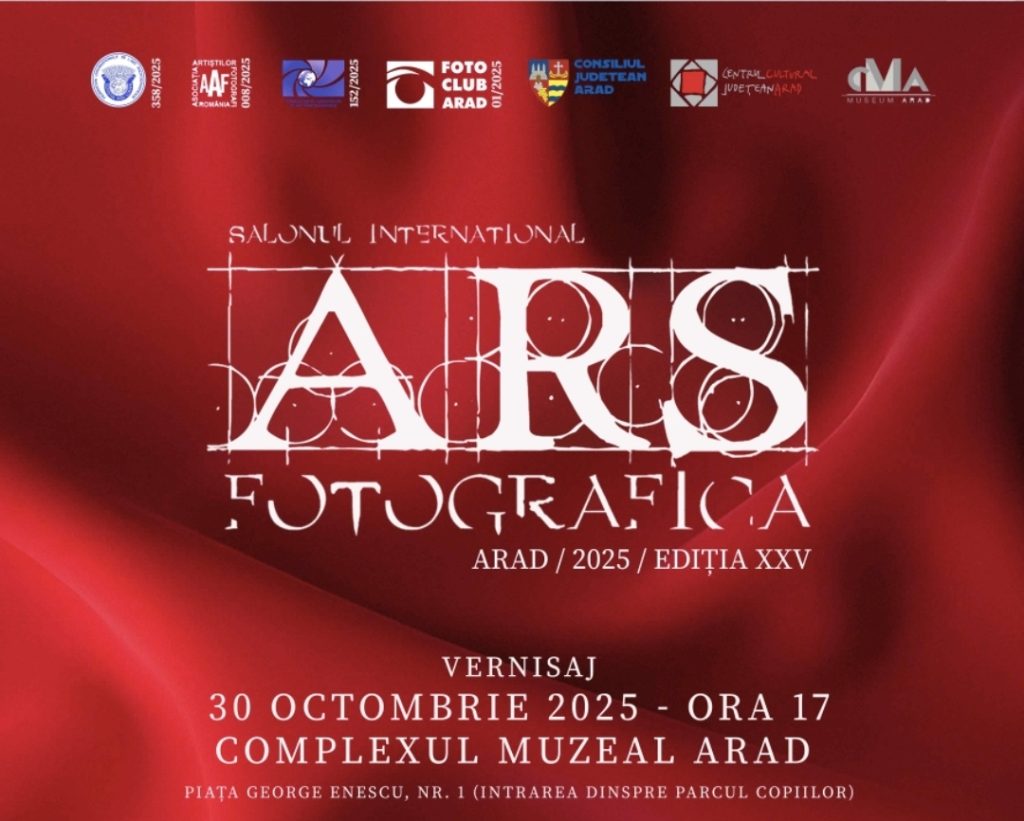 Vernisajul și decernarea premiilor Salonului Internaţional de Fotografie “Ars Fotografica” Ediţia a XXV-a Arad 2025 va avea loc în data de 30 octombrie 2025, ora 17, la Complexul Muzeal Arad, Piața George Enescu, Nr. 1 (intrarea dinspre Parcul Copiilor).