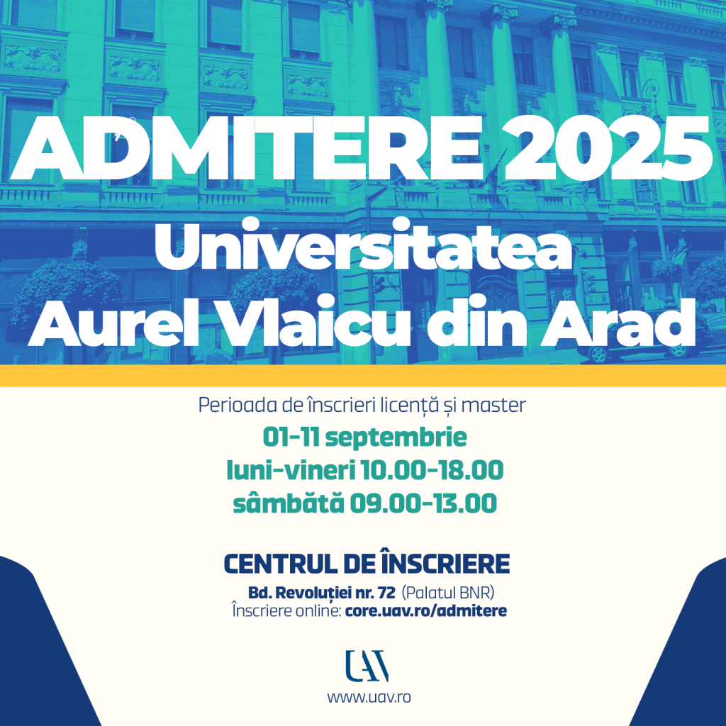 Înscrierile pentru studii de licență și master se pot face online, pe https://core.uav.ro/admitere, sau fizic, la Centrul de admitere din Bd. Revoluției nr. 72 (Palatul BNR, vis-a-vis de Primăria Arad).